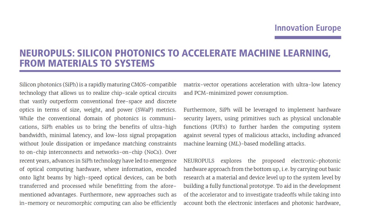 However, current neuromorphic electrical computing systems have their own limitations, which is why the NEUROPULS project is developing next-generation low-power and secure edge-computing systems. By utilizing novel photonic computing architectures and security layers based on photonic PUFs, augmented silicon photonics CMOS-compatible platforms, and emerging non-volatile phase change materials, this project aims to demonstrate a two-order of magnitude improvement in energy efficiency. With RISC-V compliant interfaces and a novel full-system simulation platform, NEUROPULS will revolutionize the future of computing.